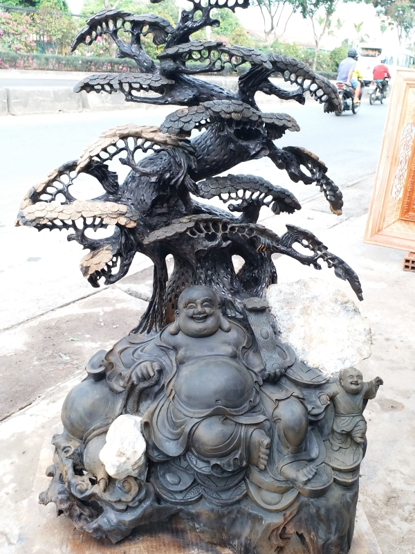 Di Lạc ngồi gốc tùng. Gỗ Mun Sừng quý hiếm. Kt 106cm 68cm 50cm
