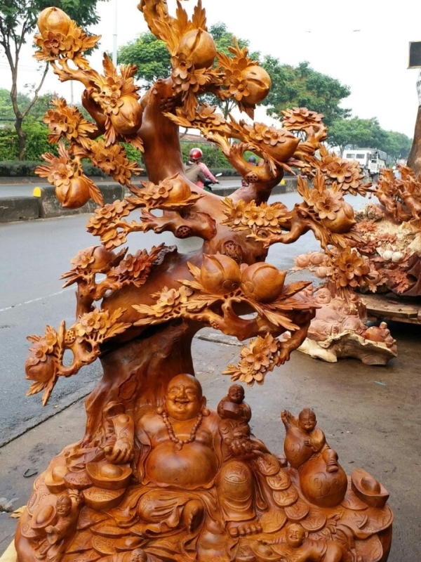 Di Lặc ngũ Phúc ngồi gốc đào - Gỗ Hương - 160cm x 110cm x 80cm